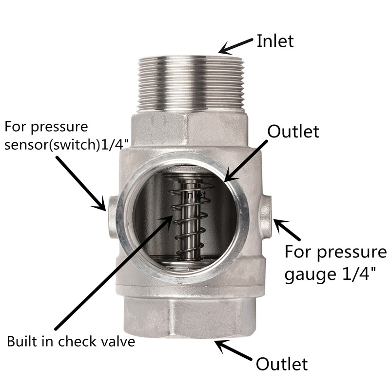 Интерфейсы: 1-дюймовый гнездовой порт (вход воды), 1-дюймовый штекерный порт (выход воды), еще один 1-дюймовый гнездовой порт (для подключения обратного клапана), 1/4-дюймовый гнездовой порт (для подключения реле давления), 1/4-дюймовый штекерный порт (для подключения манометра).